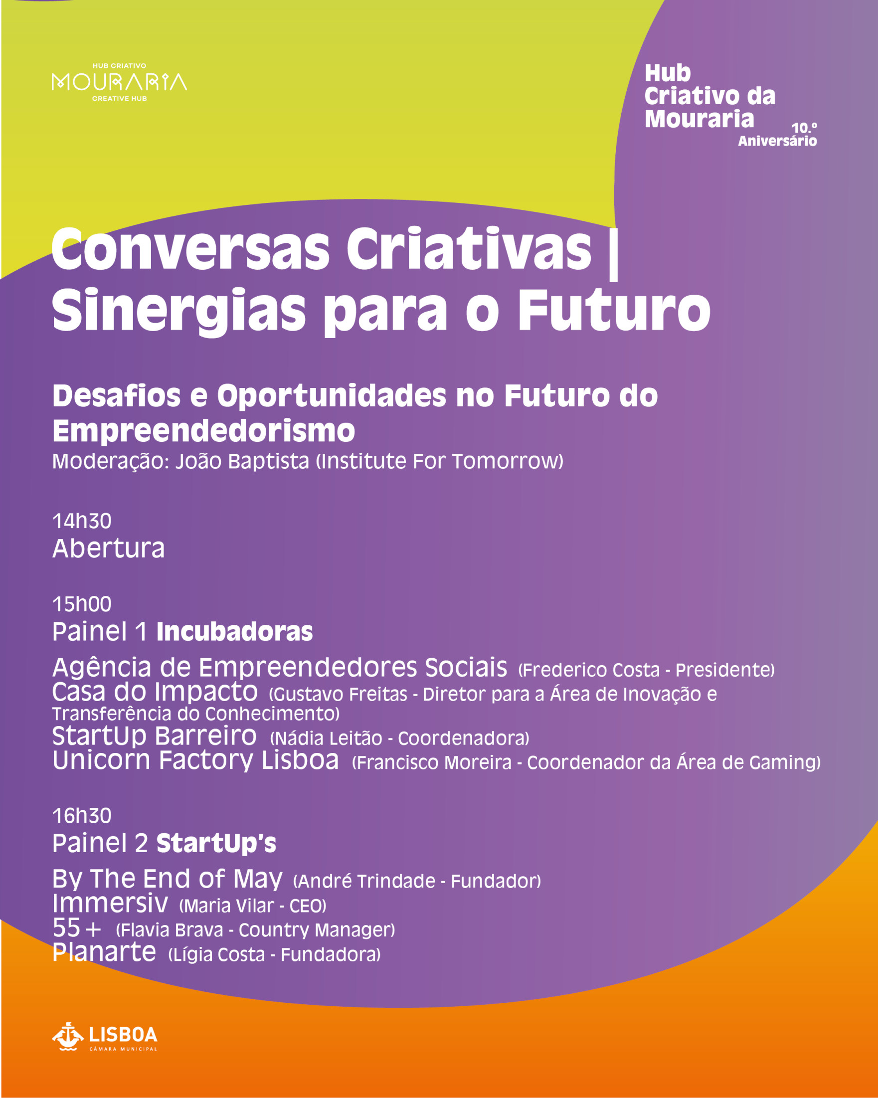 Dedicado ao tema "Desafios e Oportunidades no Futuro do Empreendedorismo", vamos ter a participação das incubadoras, Casa do Impacto, Startup Barreiro e da Agência Empreendedores Sociais, num primeiro painel, seguido de um segundo painel, com a apresentação de projetos e Startup´s, inovadores, das incubadoras convidadas. A ideia é juntarmos pessoas com percursos e perspetivas diferentes, mas com algo em comum: a vontade de pensar o futuro das cidades, da cultura e do empreendedorismo 2.0, com mais enfoque no setor criativo.