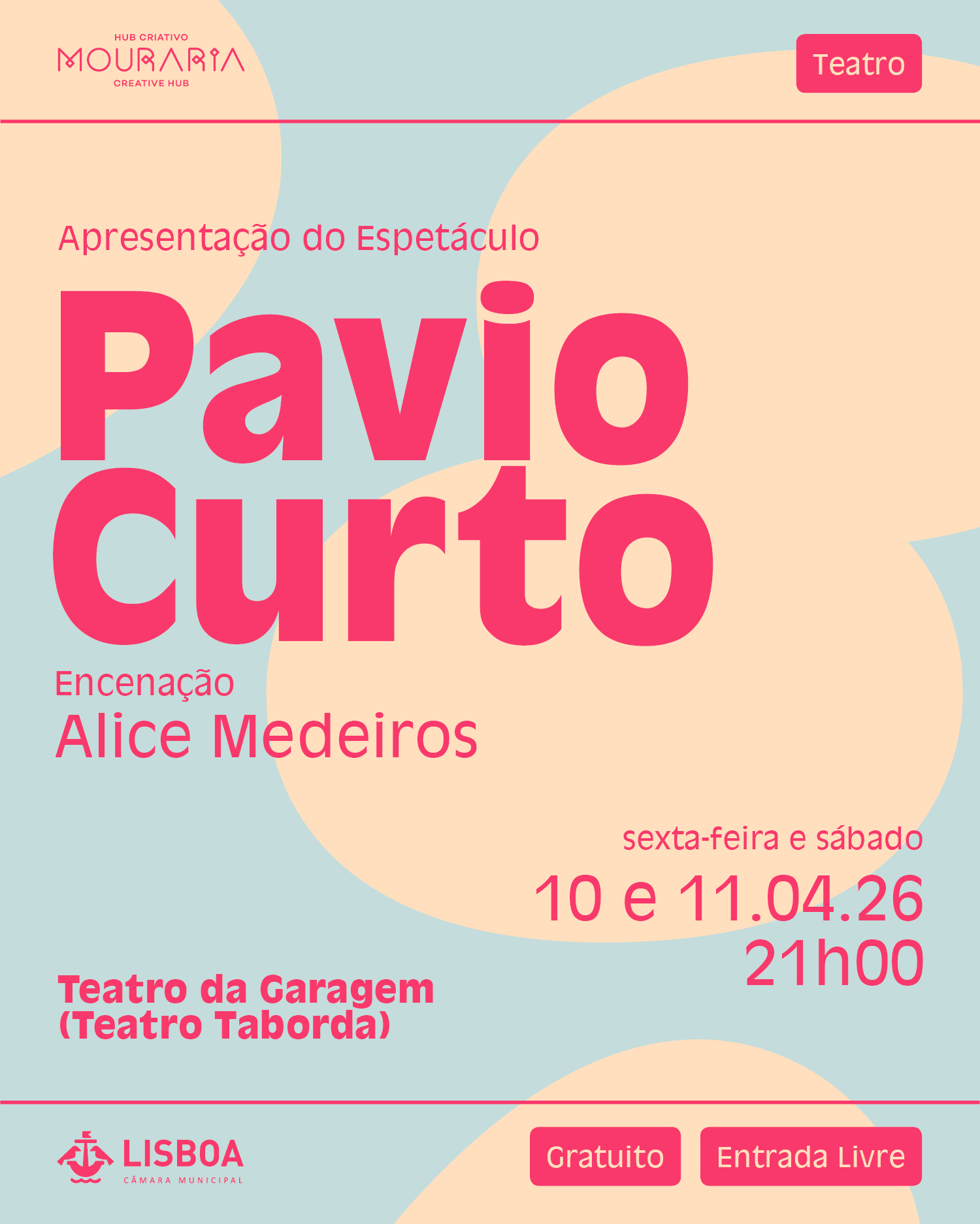 Nos dias 10 e 11 de abril, pelas 21h, a apresentação final de Teatro será no Teatro da Garagem! Escolhemos uma sala de espetáculos de forma a aumentar a profundidade da aprendizagem dos recursos performáticos e criativos trabalhados ao longo do Laboratório.